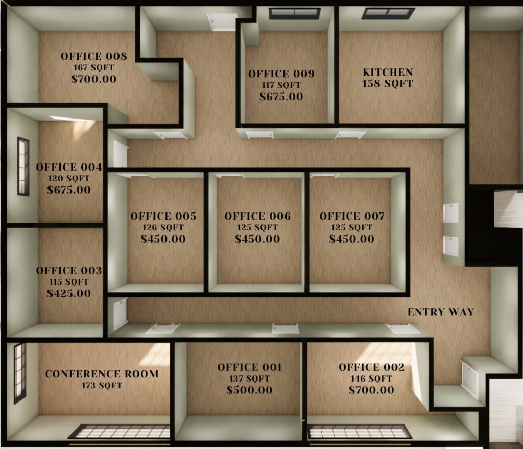 Our individual offices are available on flexible month-to-month leases, making it easy for you to adapt as your needs change. This pricing is for month-to-month leases and is inclusive of NNN and utilities (water, electricity, internet). There are meeting rooms, a shared kitchen/break room and 24/7 electronic access.